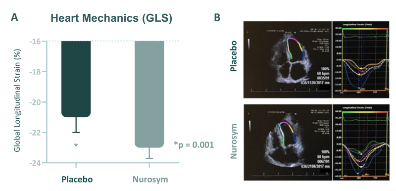 After 3 months of Nurosym treatment, an decrease in deformation of heart muscle (indicated by GLS improvement (left ventricular function) of approximately ~11% was observed compared to the control group, and this improvement was associated with a reduction in cardiovascular disease risk factors (doi: 10.1161/JAHA.121.023582).