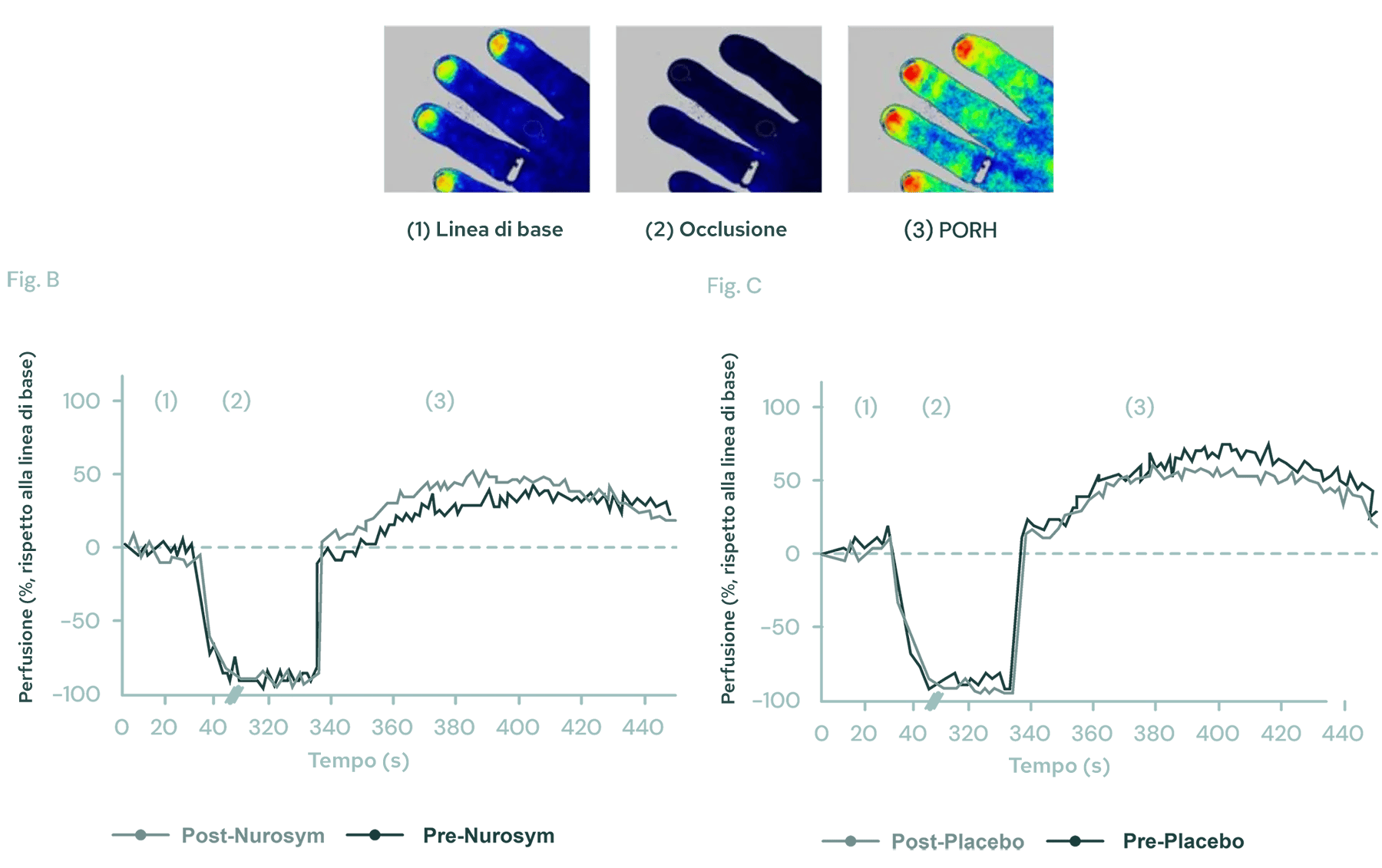 Nurosym ha aumentato il flusso sanguigno alle mani, un indicatore della funzione microcircolatoria. Dopo Nurosym sono stati osservati tassi di perfusione significativamente più elevati nel gruppo di neuromodulazione rispetto al placebo. Nurosym è stato associato a un aumento significativo dell'iperemia rispetto al basale (dall'85,57% al 140,5%, p = 0,03) e a una variazione di X volte della perfusione (da 1,86 a 2,41, p = 0,03).